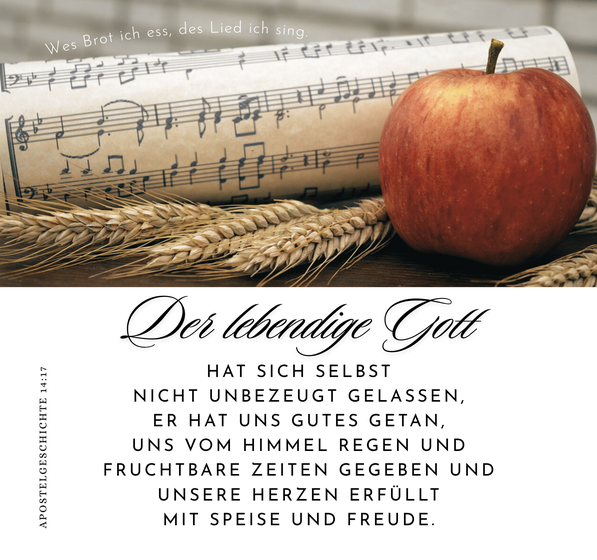Der lebendige Gott hat sich selbst nicht unbezeugt gelassen,er hat uns Gutes getan, uns vom Himmel Regen und fruchtbare Zeiten gegeben und unsere Herzen erfüllt mit Speise und Freude. Apostelgeschichte 14:17